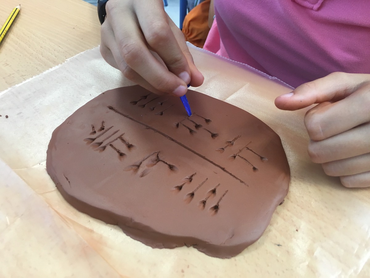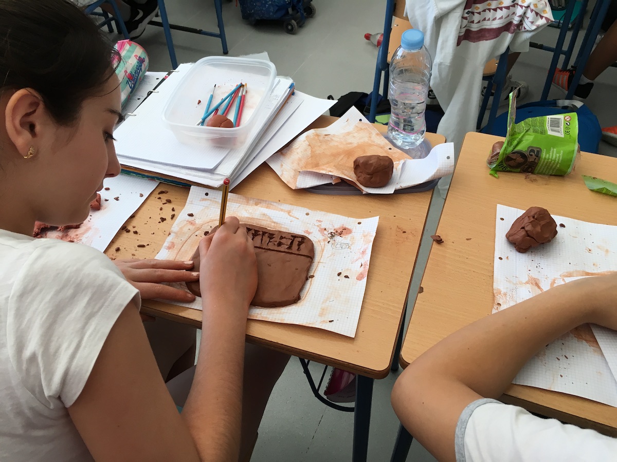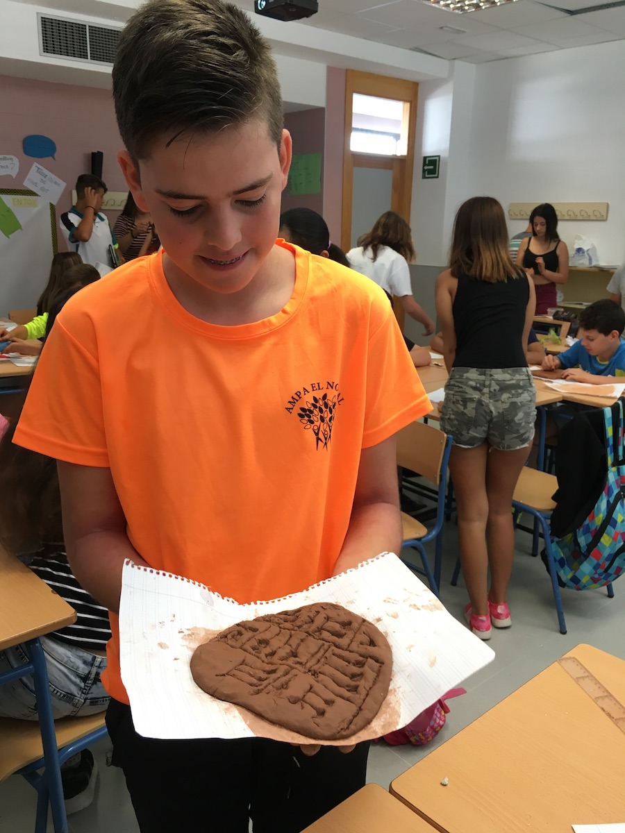 En este caso el alumnado de 1º de ESO traería arcilla de color marrón para recrear las tablillas cuneiformes y el alumnado grabaría en ellas su nombre en ellas con unos palillos o incluso también aprovechamos el capuchón de los bolígrafos para hacerlo.