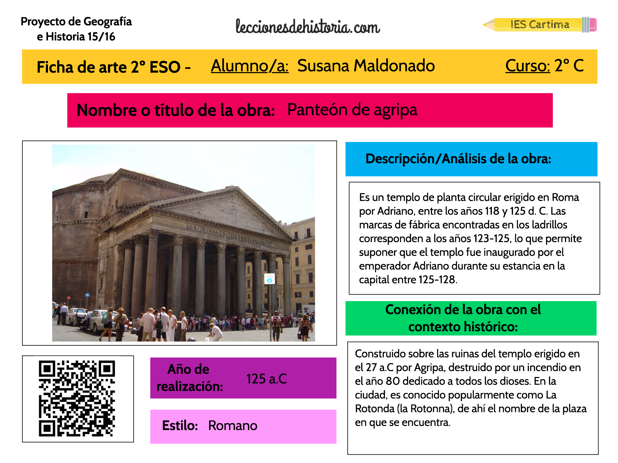 El curso pasado este proyecto lo llevé a cabo en 2º de ESO, pero al acabar el curso me nombraron presidenta de tribunal de oposiciones y no pude terminar la compilación de fichas para crear el producto final del proyecto: el libro digital. Pues bien, nunca es tarde si la dicha es buena ¿no?. Al comenzar este curso terminé de recopilar las fichas que me faltaban con el alumnado, y finalmente hemos podido lanzar el Volumen 6 de este proyecto: un libro de historia del arte de 2º de ESO.