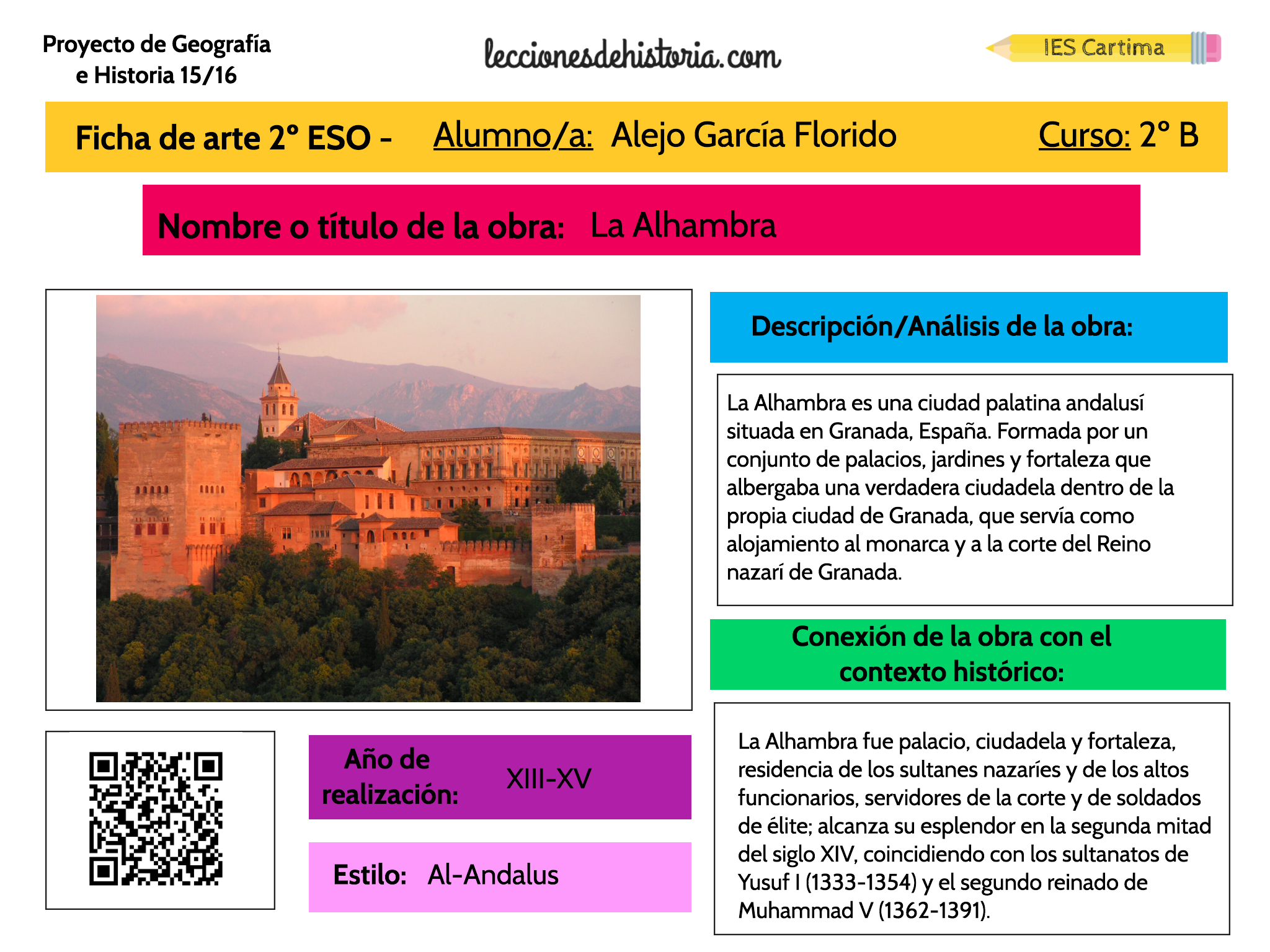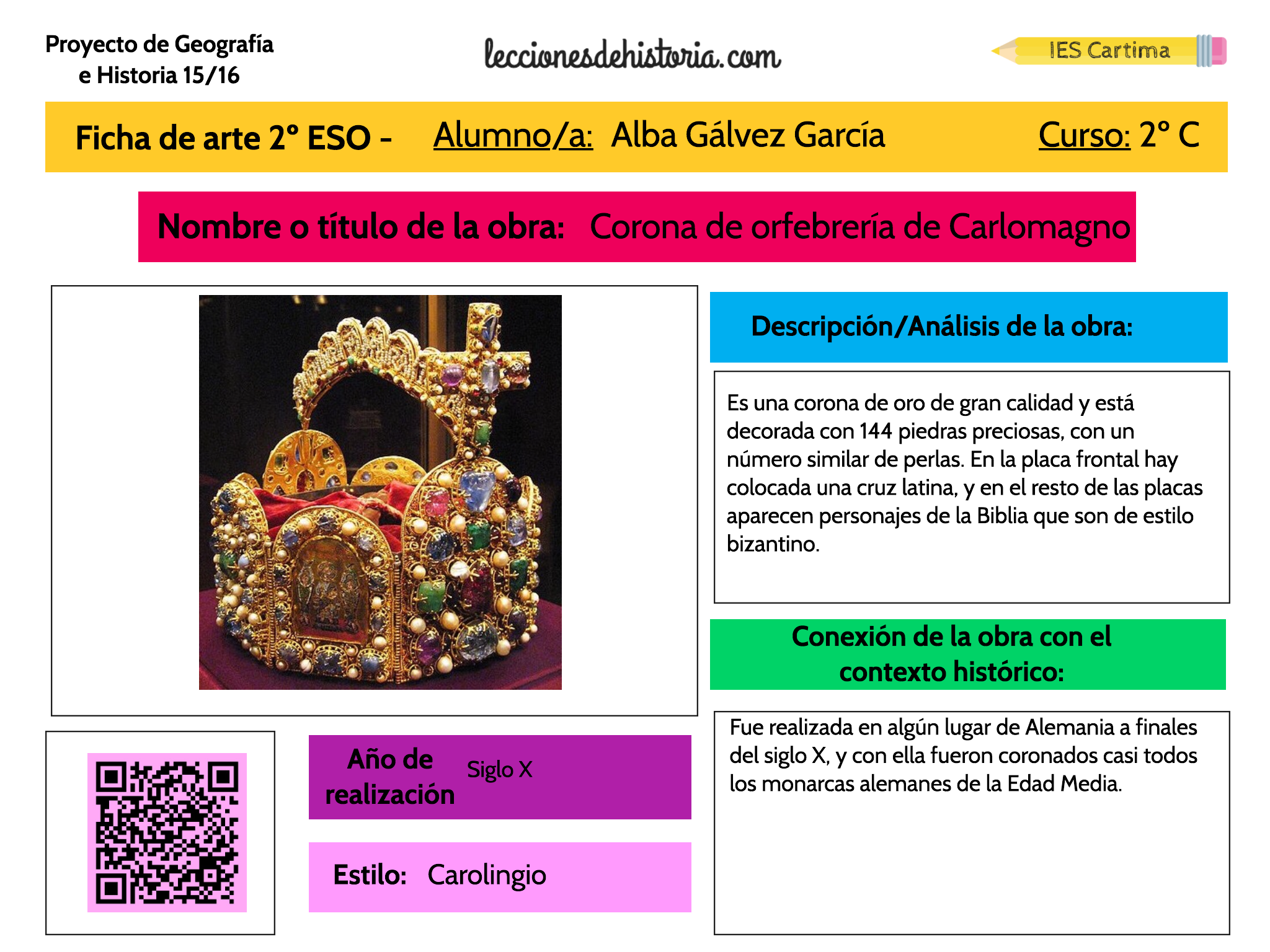Una vez creada la ficha, tenía alumnos encargados de compilar las fichas por estilo de arte, de esta forma íbamos creando los capítulos del libro poco a poco. El arte que hemos visto a lo largo del curso y que está recogido en el libro es: romano, bizantino, carolingio, islámico, andalusí, románico y gótico. Finalmente el arte precolombino y el renacimiento lo vimos en clase, pero no nos dio tiempo a poder realizar las fichas de arte, por lo que este año me lo he propuesto como una meta conseguirlo.
