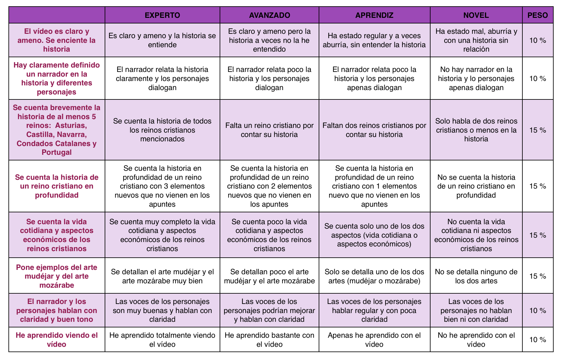 Para poder realizar este proyecto me propuse que hicieran un Storytelling, aprovechando que mi compañera Laura de Lengua ya había trabajado con mi alumnado los cuentos, me venía como anillo al dedo este proyecto, en el que tendrían que investigar sobre los diferentes Reinos Cristianos de la época y la Reconquista a los musulmanes hasta 1492 en el que Boabdil entrega las llaves de la ciudad de Granada a los Reyes Católicos. Tras visualizar los vídeos que tengo preparados para mi alumnado con Flipped Classroom y diferentes actividades, propuse este proyecto con la siguiente rúbrica de evaluación que os dejo a continuación.