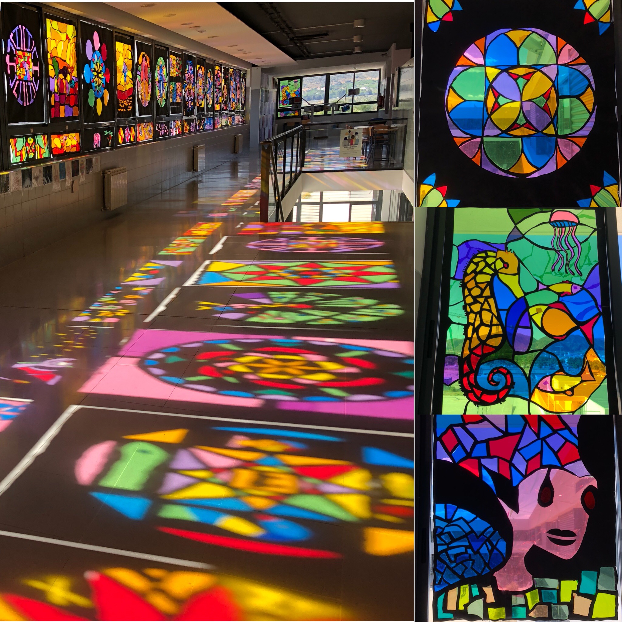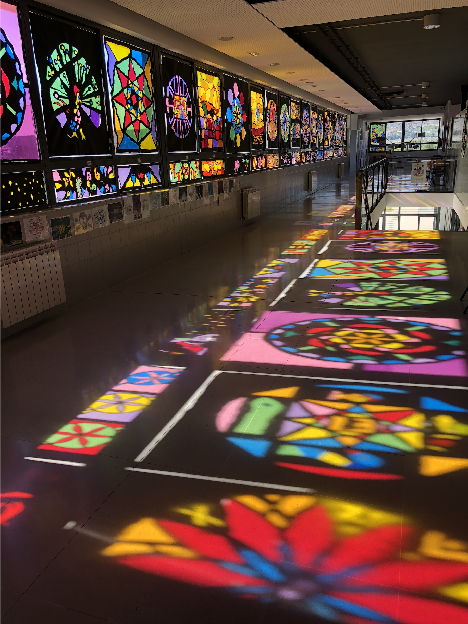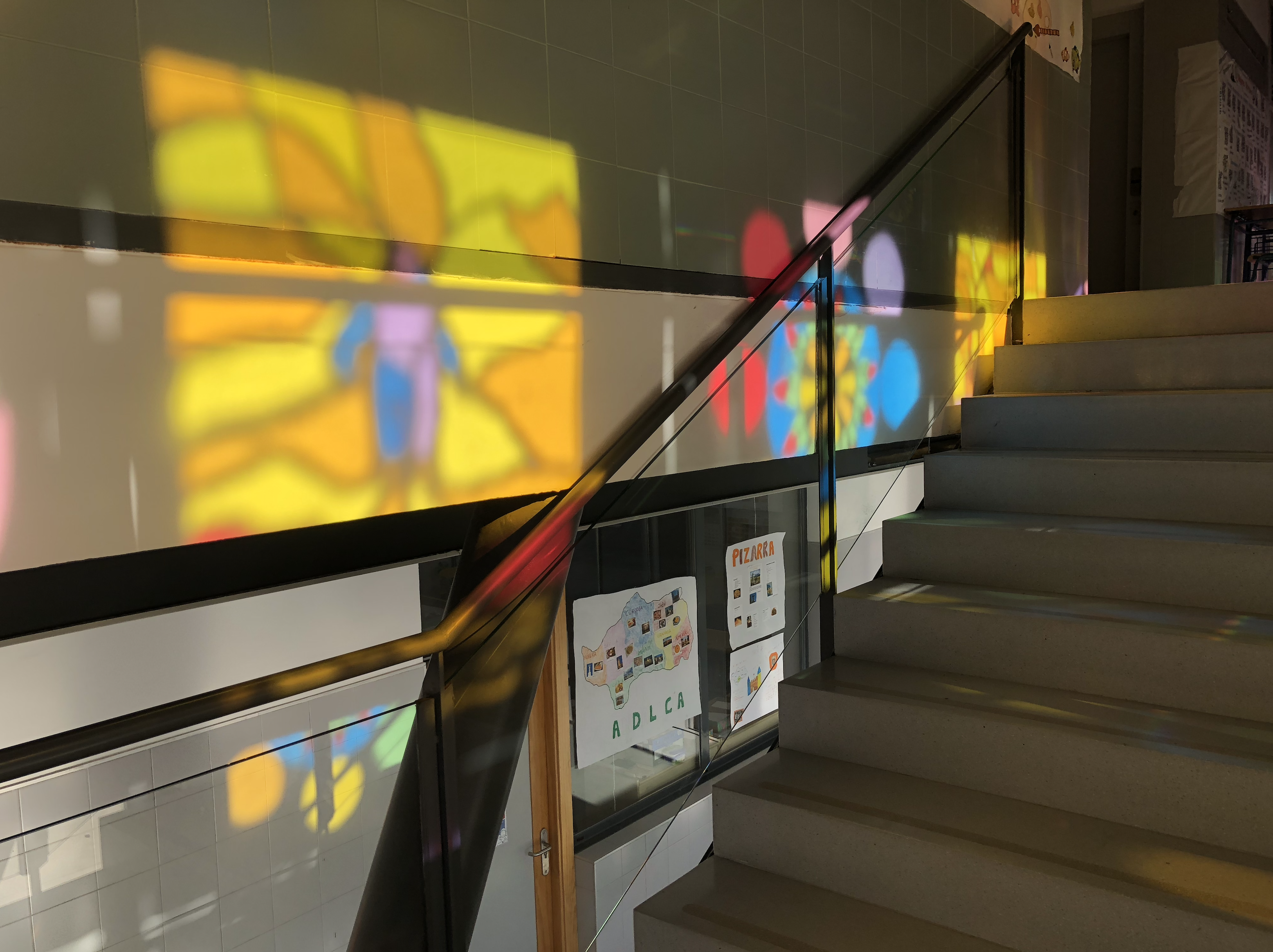 Una vez terminado, al colocar las cartulinas en las ventanas, quedan unas vidrieras maravillosas. Cuando les da el sol, convierten todo el pasillo en colores, que le dan vida al centro. Tristemente, cuando pasan las semanas y el sol, terminan perdiendo el color. Pero ahí está lo bonito, el nuevo reto que llegará al curso siguiente.