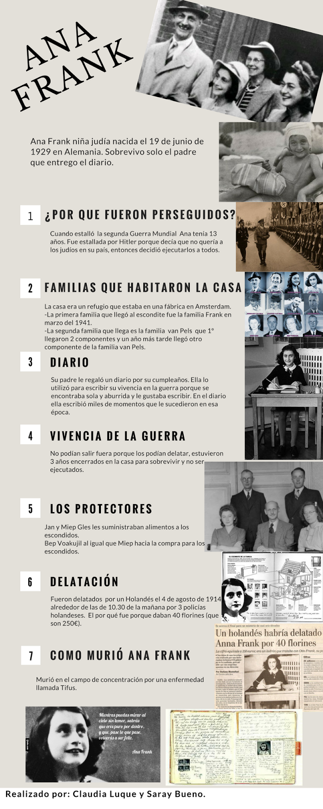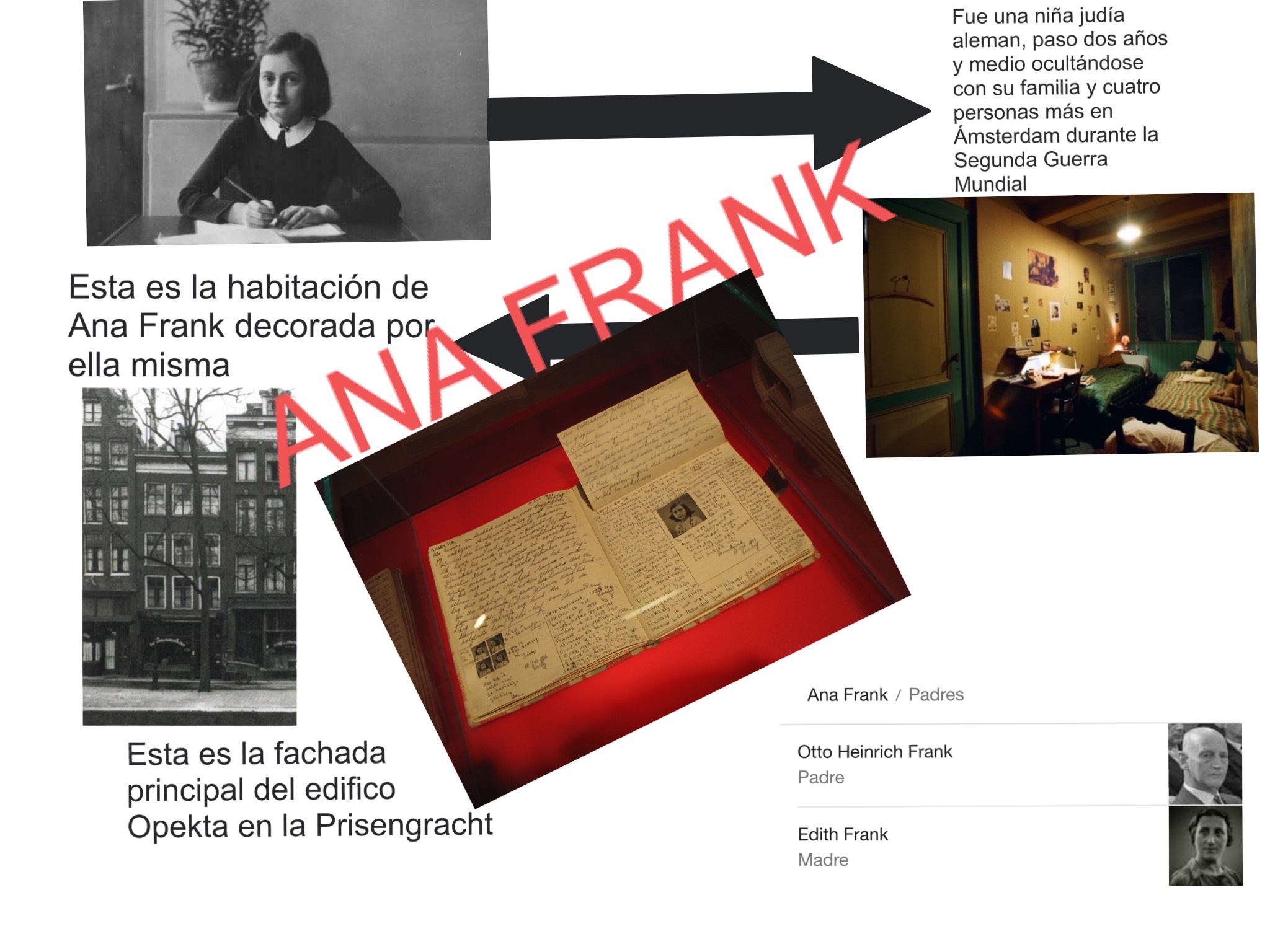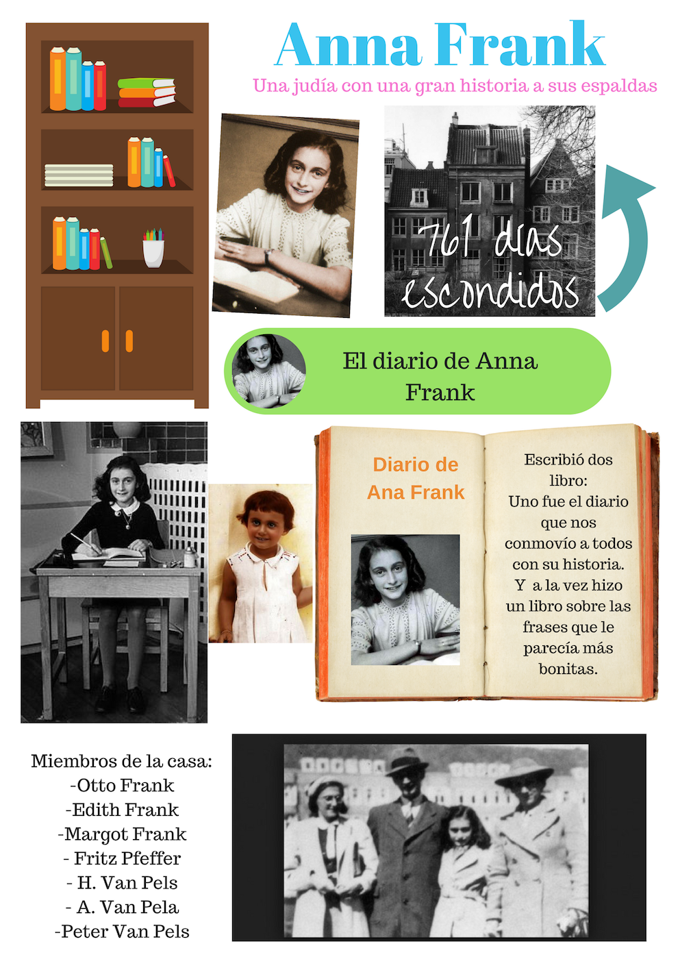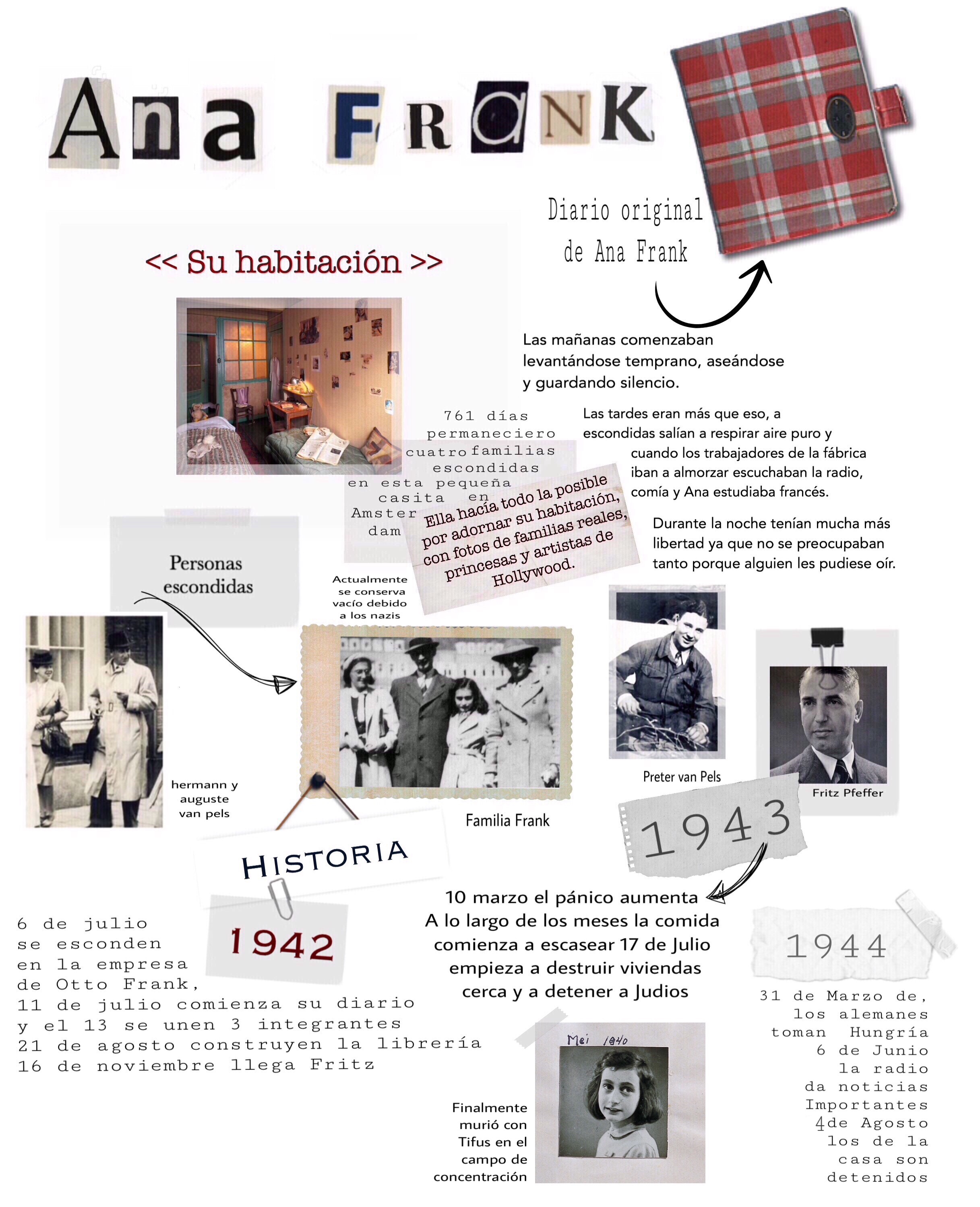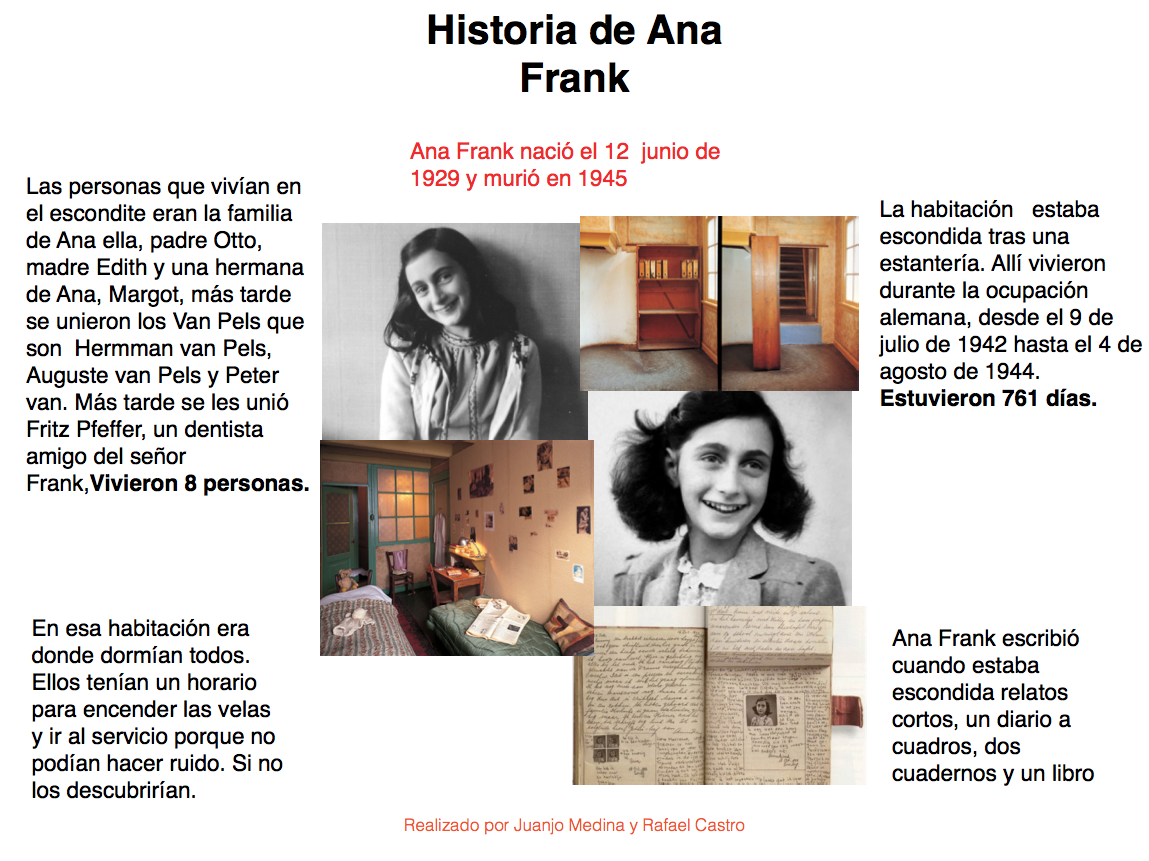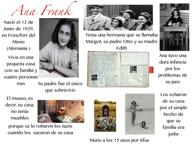 Así, nos pusimos a trabajar una ficha sobre la película y debatir sobre ella sobre los Derechos Humanos. Tras ello, profundizamos en la vida de Ana Frank, la historia, los escondidos, la casa de atrás y los implicados en llegar a los escondidos. Tras la investigación, el proyecto consistió en realizar un collage digital de fotografías e información sobre Ana Frank y exponerlo ante sus compañeros.