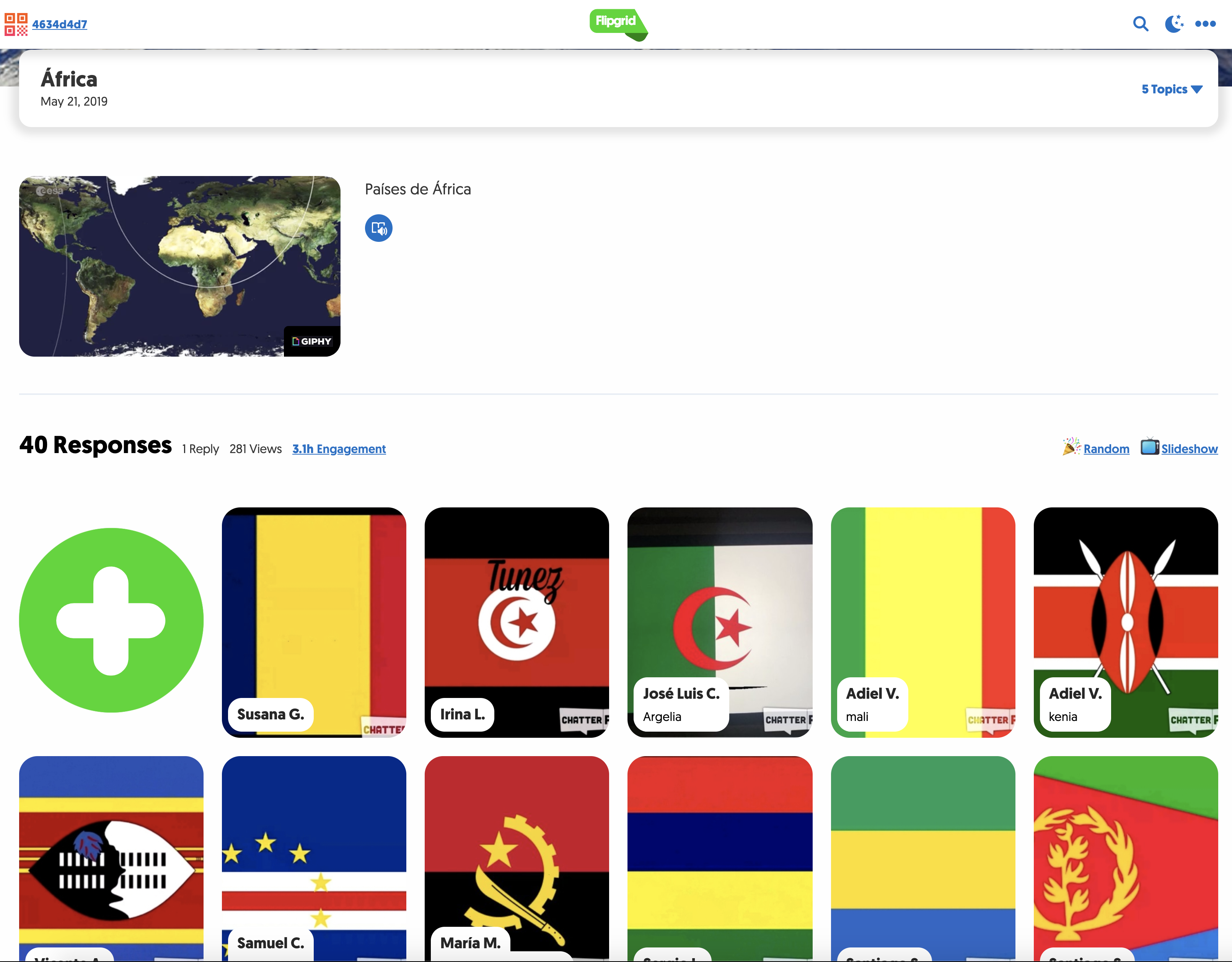 Una vez grabados todos los vídeos con Chatterpix, los subían a Flipgrid en el continente al que corresponde el país. De esta forma logramos una biblioteca con toda la información de todos los países del mundo, explicada por mi alumnado.