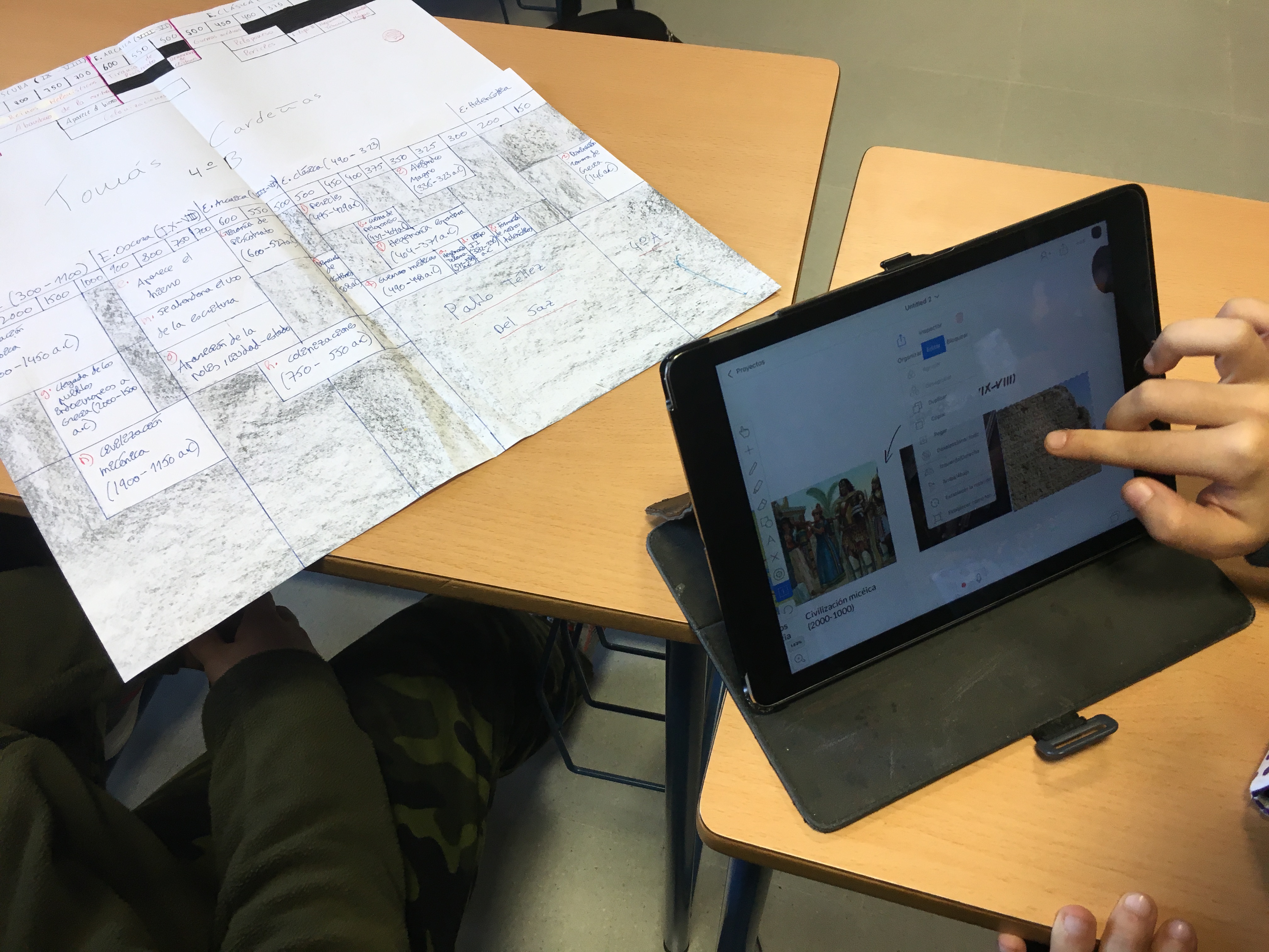 ¿Cómo hicimos? Pues Explain Everything te permite insertar imágenes, a y su vez, juntarlas todas, para que se creen como una sola. De esta forma, poniendo una al lado de la otra al mismo tamaño, se va creando el eje cronológico. Posteriormente fueron creando los títulos, y al igual que hicieron con las imágenes, las juntaron todas, haciendo de todo lo creado un bloque. De esta forma, podían ampliar e ir explicando el eje cronológico.