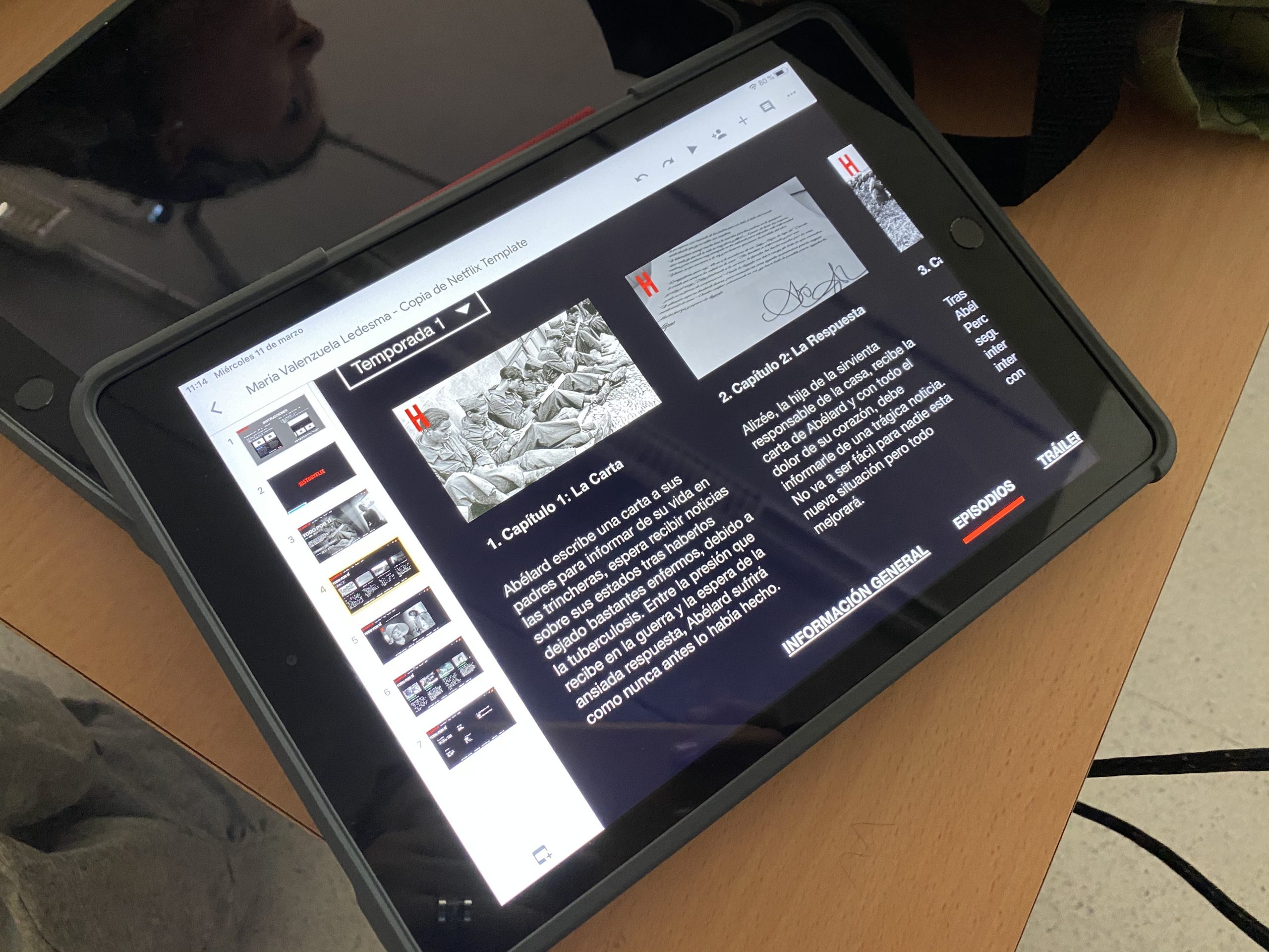 El toque «papel» era esta primera parte del proyecto. El toque «tecnológico» se lo di al proyecto con una segunda parte que yo propuse. Me rondó la idea cuando vi el curso pasado un proyecto de Cristian Olivé usando una plantilla de Netflix. Ahí se me ocurrió que la historia del intercambio de cartas, se podría llevar posteriormente a una docu-serie de Netflix. Así tendrían que hacer un resumen de la historia, diseñar 4 episodios, un tráiler y finalmente, investigar las historias de sus compañeros de clase para añadirlas al apartado «coincidencias» de Netflix. Toda la información del proyecto Historyflix la tienes en este PDF con sus rúbricas de evaluación, que preparé para presentar al alumnado.