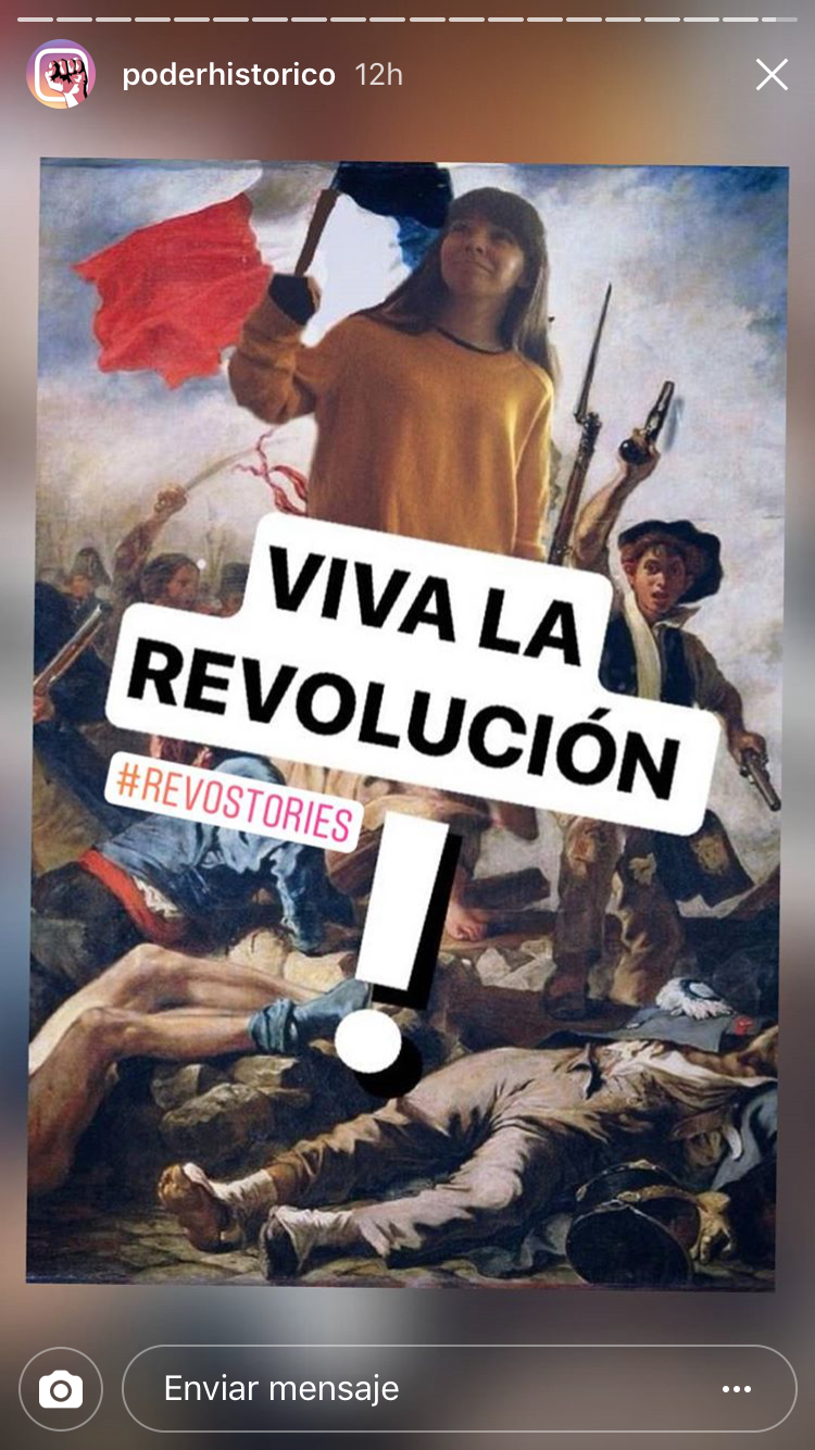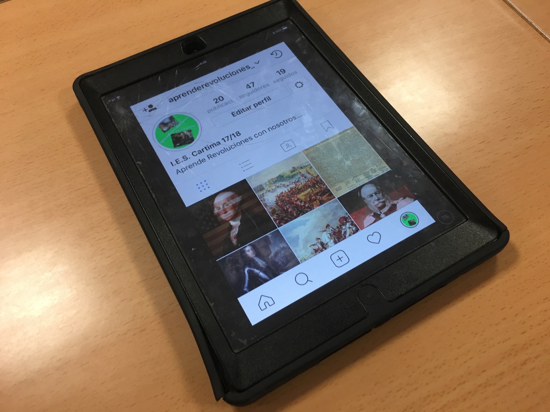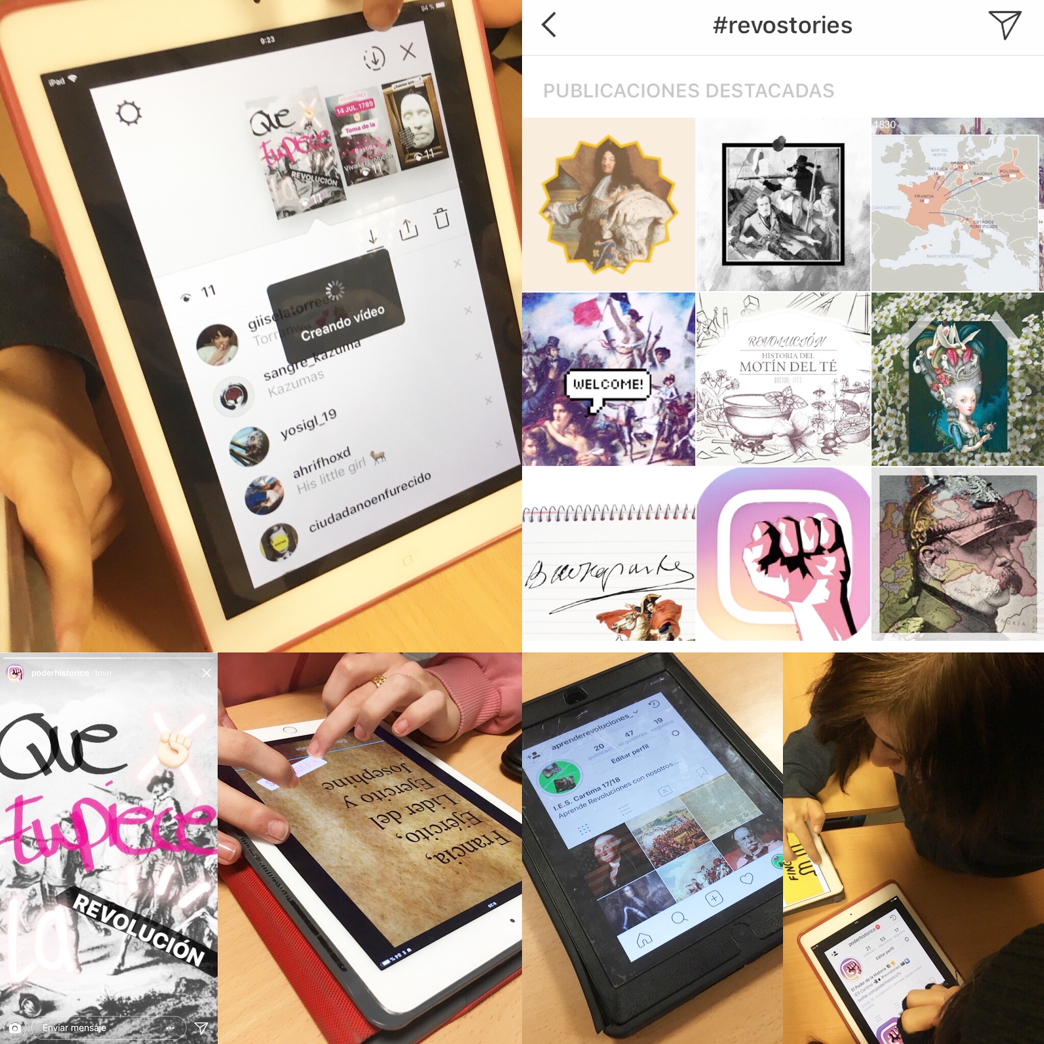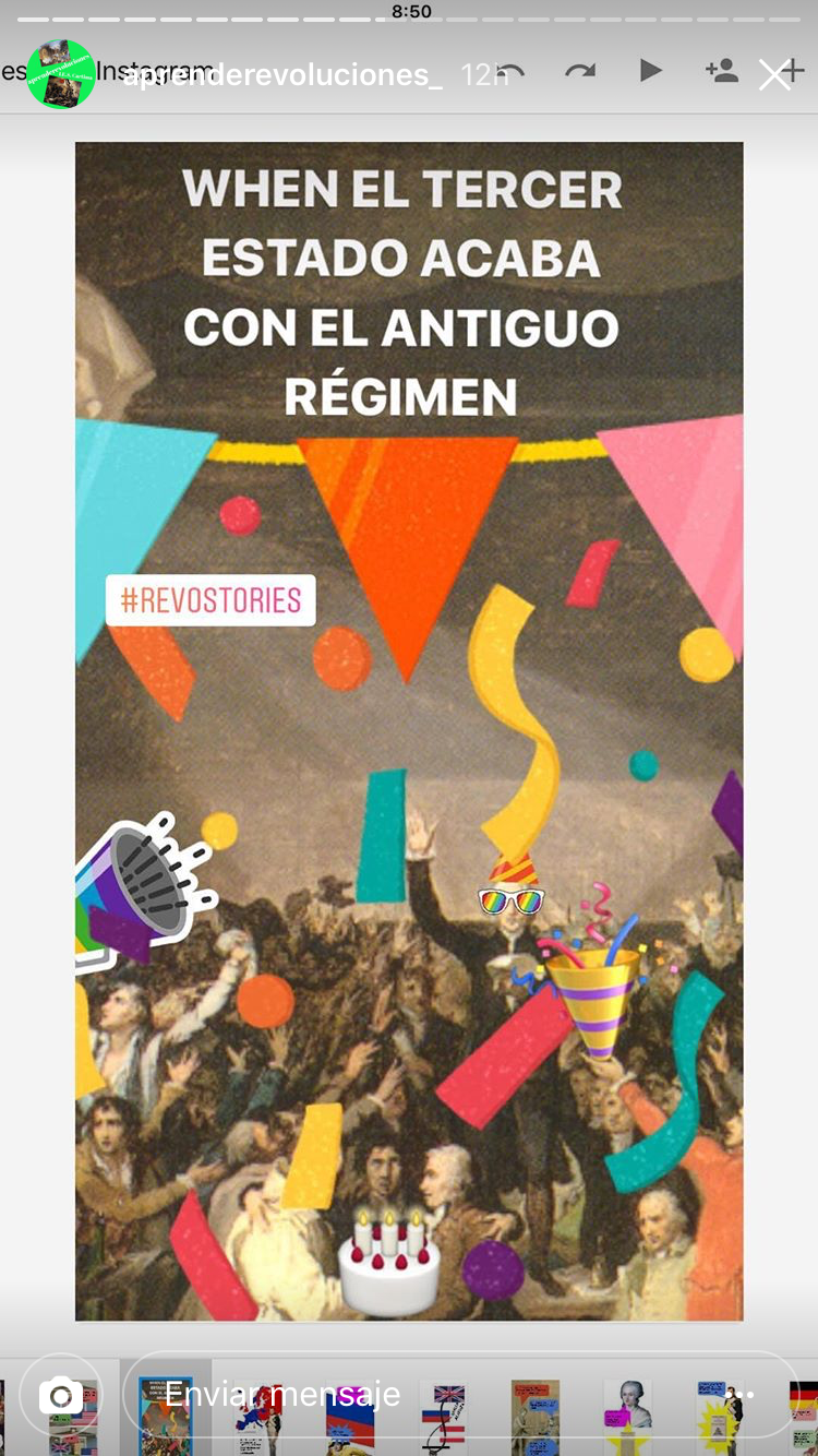 Por un lado tendrían que realizar una cuenta de Instagram por grupo, al igual que hicieron con Twitter. Así publicarían fotos históricas relacionadas con las unidades que habíamos visto y las revoluciones históricas. En este caso se trataba de realizar fotos originales y que atrajeran a los seguidores. A su vez, Isabel García, desde Madrid, también hacía su versión de proyecto con Instagram, por lo que nos pusimos en contacto. Así que entre el alumnado de ella y los míos, se fueron dando a me gusta y aprendiendo entre ellos gracias a las fotos de Instagram.