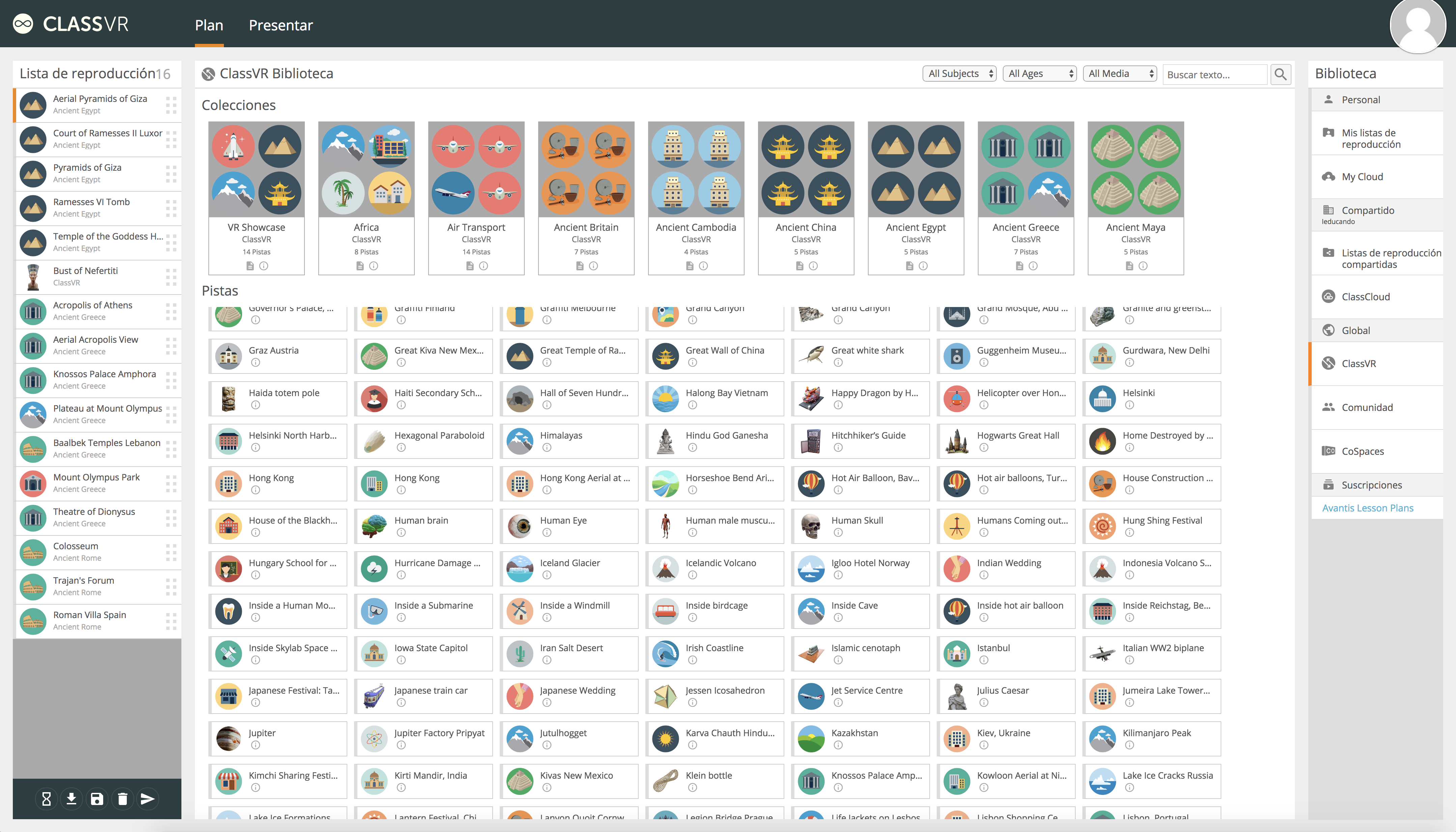 ClassVR incluye una biblioteca donde tiene todas una base de datos recogida por materias y especialidades. La verdad que el panel de ClassVR es bastante intuitivo y puedes buscar rápidamente todos los contenidos. Además, desplazando a la izquierda lo que quieres, montas tu propia expedición rápidamente arrastrando y soltando.