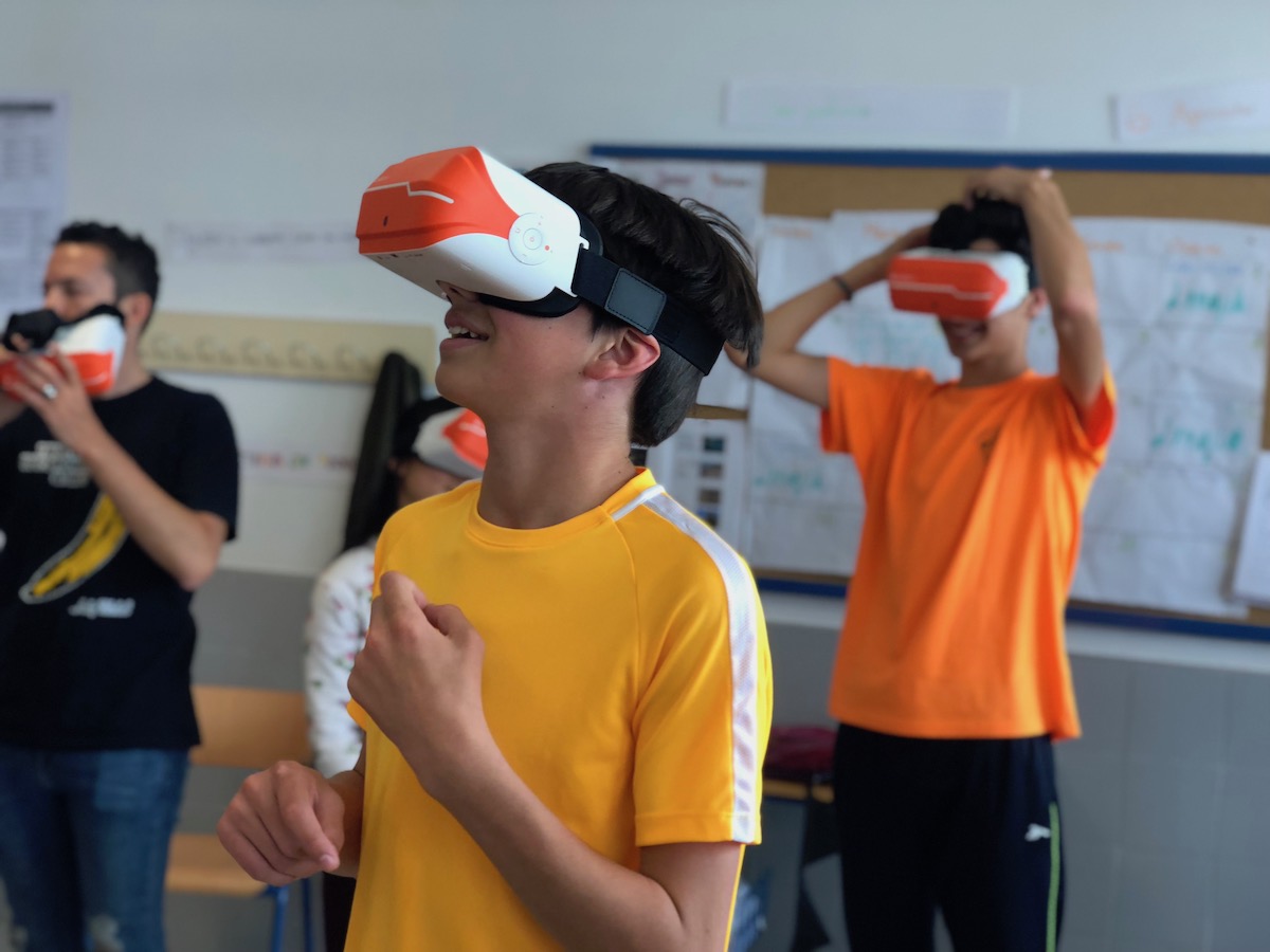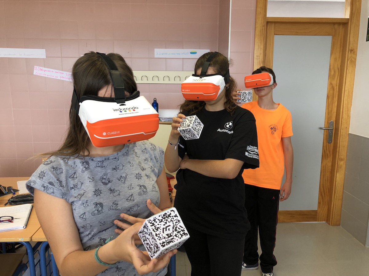 A finales del curso pasado, tuve la gran oportunidad de probar con mi alumnado las gafas ClassVR gracias a iEducando. ¿De qué tratan las Class VR? Se tratan de unas gafas de realidad virtual y a su vez de realidad aumentada. Las ClassVR incluyen un cubo como con códigos QR, que imprimes y ensamblas. Este cubo sirve para enfocar con las gafas y así traer la realidad aumentada a tu mano. El cubo lo reconoce ya que tiene una cámara delantera las gafas, que reconocen el cubo en cuanto lo colocas delante tuya.
