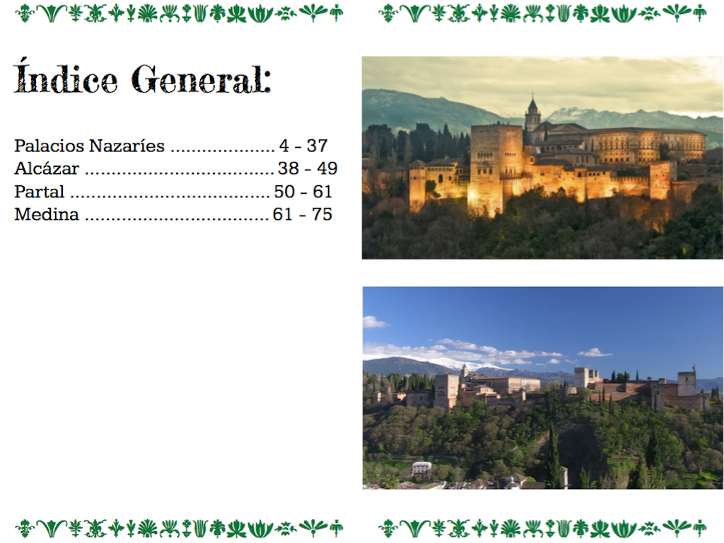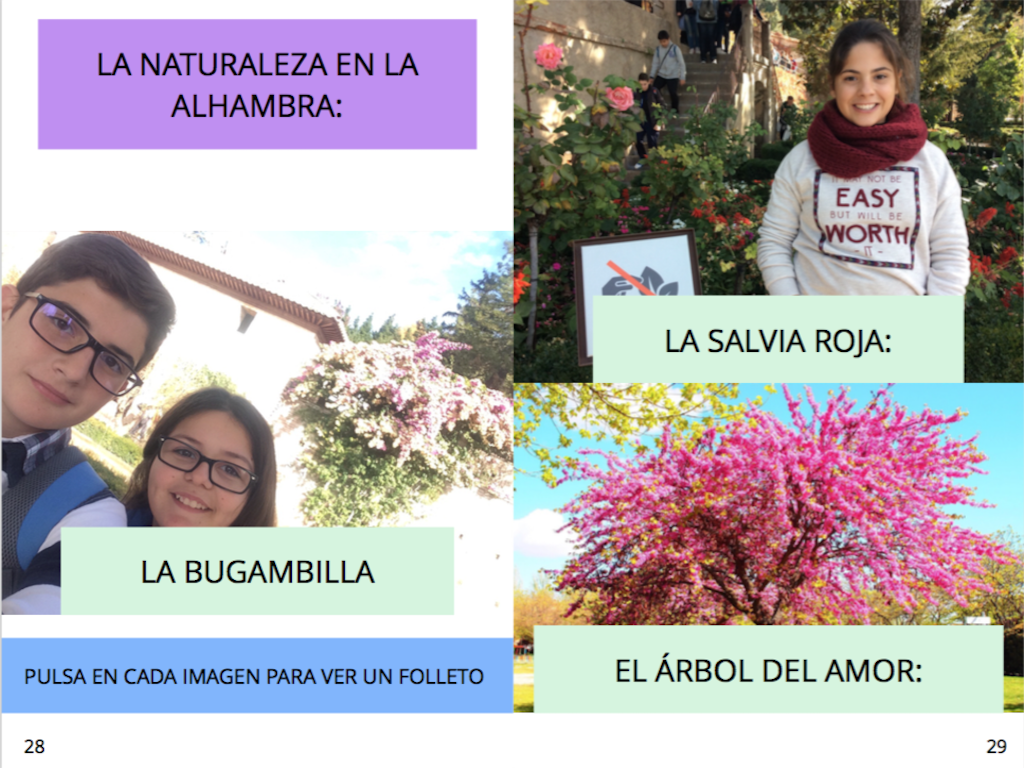 Finalmente, desde Ciencias Naturales se trabajaron las plantas del Generalife, hicieron un folleto de las diferentes plantas que está hipervinculado en cada guía. Desde Educación Física trabajaron la orientación con un mapa de la Alhambra. Desde inglés trabajaron las rutas de Washington Irving e incluyeron un glosario al final de cada parte de la guía. Desde matemáticas trabajaron cálculos de escalas matemáticas con el mapa. Así han Aprendido la cultura hispano musulmana a través de la Alhambra, enlazando todas las materias del curso de 2º de ESO.