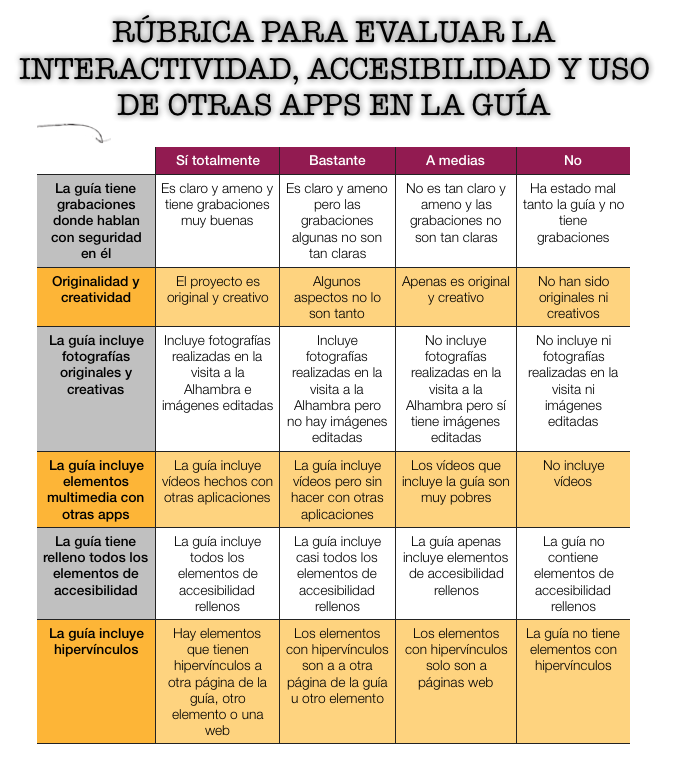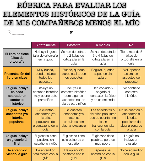 Para la evaluación del proyecto, cada grupo tuvo que exponer su parte de la guía defendiéndola. Para ello, evaluamos con tres rúbricas: una en la que el alumnado evaluaba a los miembros de su propio grupo; otra donde se valoraría la exposición oral de la guía y los contenidos históricos; y otra rúbrica donde se valoraría la competencia digital, donde tendrían que usar otras apps, hipervincular elementos y rellenar toda la accesibilidad de la guía.
