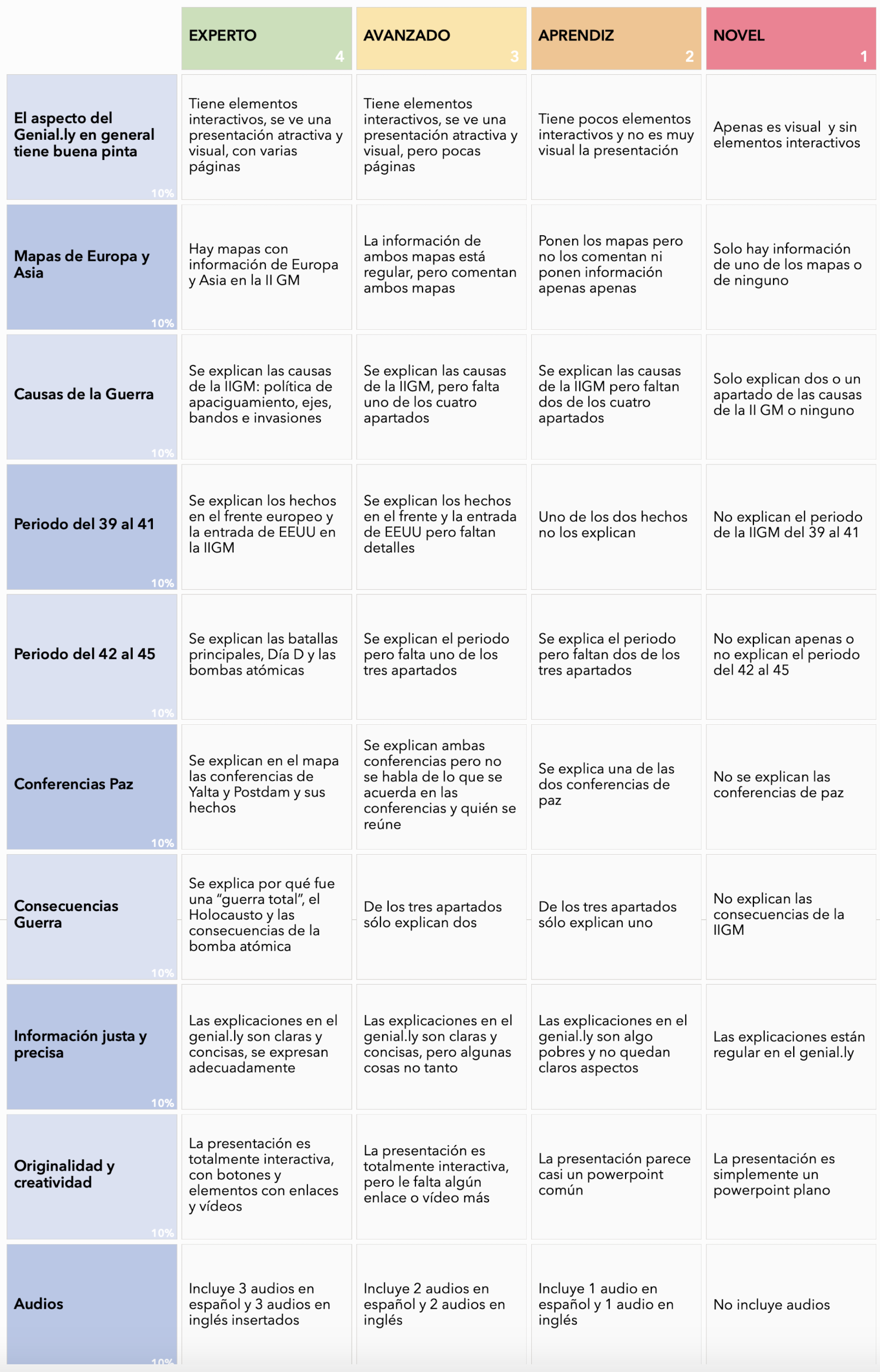 De esta forma, diseñé un proyecto en el que trabajaran los contenidos de la unidad. Les expresé que no quería un “PowerPoint” plano, sino, una presentación interactiva. Diseñé la rúbrica que veis en la imagen (pincha en ella para ampliar) para compartirla al alumnado, y de esta forma, que les quedara claro lo que pedía en el proyecto.